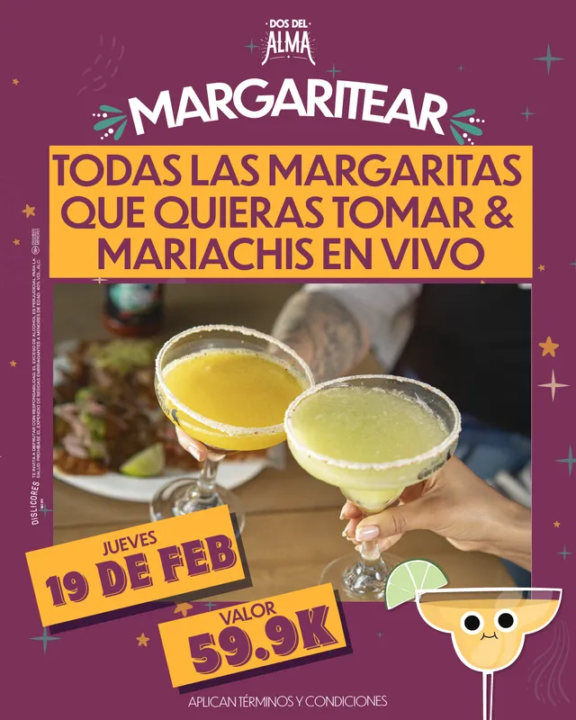En caso de compartir promoción, la margarita será cobrada a precio de la carta.