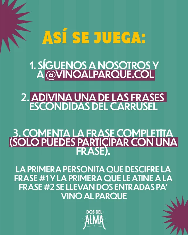 ¿QUÉ?: Armamos una dinámica pa’ la bandita: descifrar UNA de las frases escondidas en emojis del carrusel. Los más rápidos se llevan dos entradas cada uno pa’ disfrutar Vino al Parque.