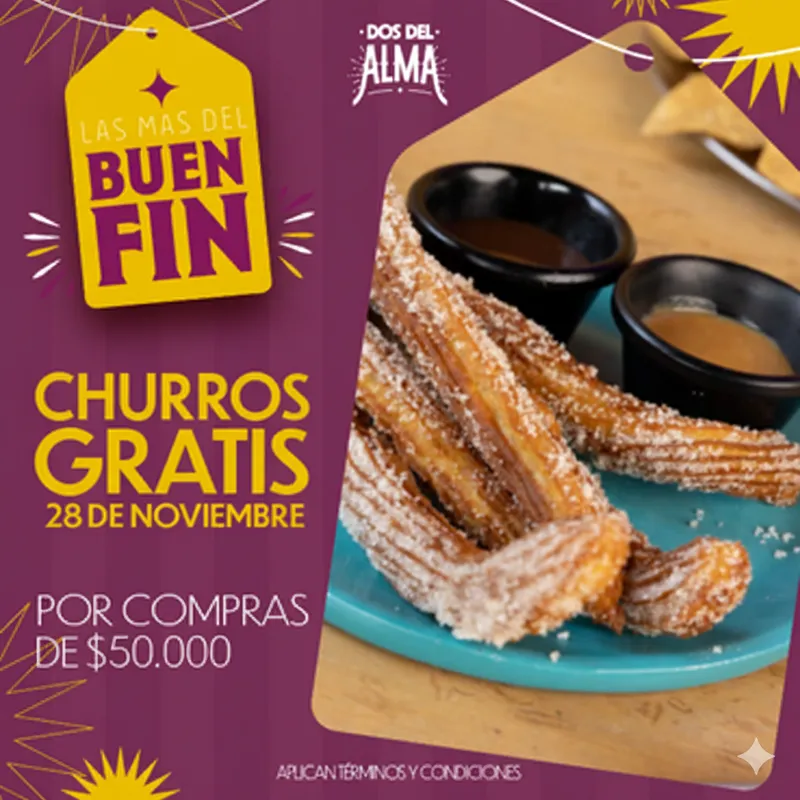 En el Black Friday, por compras iguales o superiores a $50.000 COP, recibe unos churros totalmente GRATIS para cerrar tu experiencia con el mejor toque dulce de Dos del Alma Taquería.