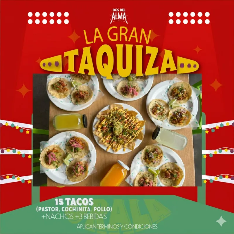¿QUÉ?: 15 TACOS + NACHOS + 3 BEBIDAS POR $151.700