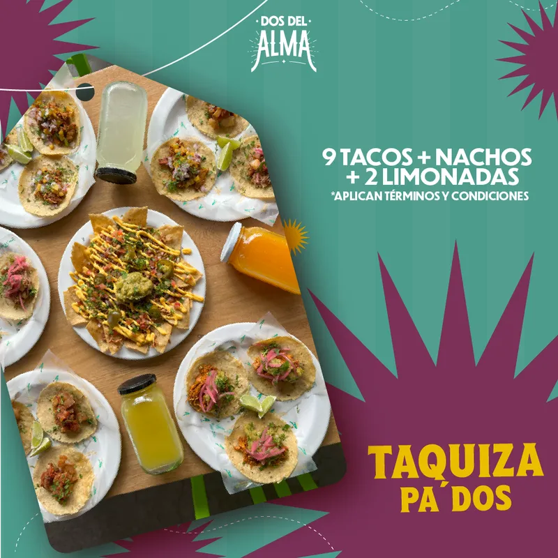 ¿QUE?: 9 TACOS + 2 LIMONADAS + NACHOS POR $97.900 COP.