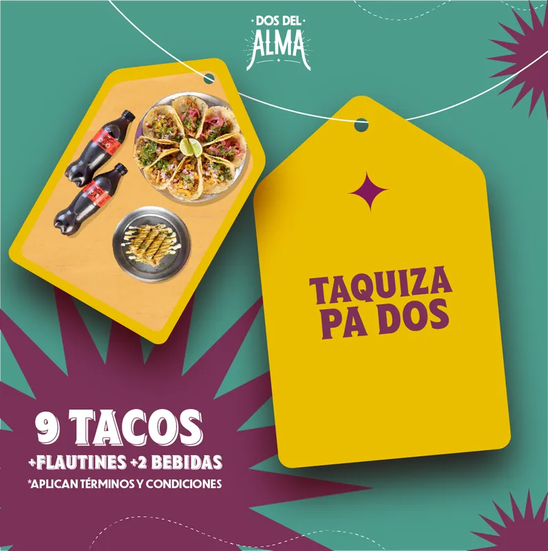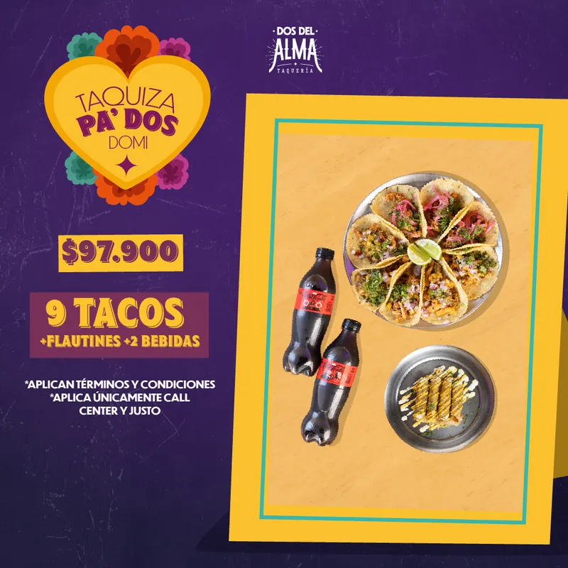 ¿QUÉ?: 9 tacos + Flautines + 2 Coca Colas por $99.900 cop.